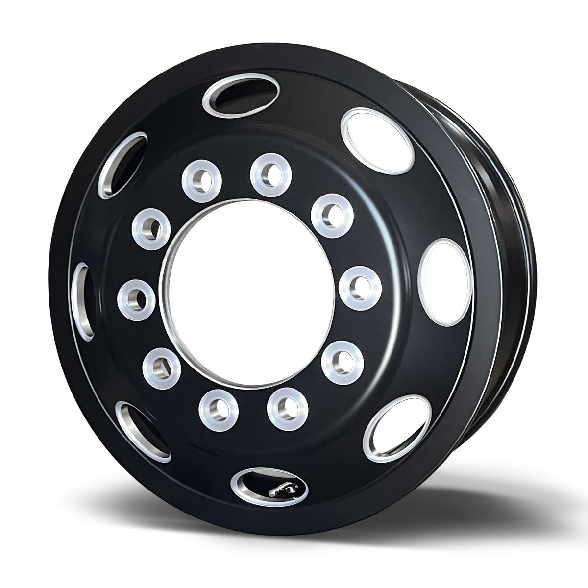 Upgrade your rig with a bold new look and heavy-duty performance. This 22.5 x 8.25 satin black aluminum wheel features round vent holes with precision-milled accents, giving it a modern, high-end appearance that stands out on the road. Designed for the front/steering position, this premium wheel offers both style and strength, compatible with most new model semi-trucks including Peterbilt, Kenworth, Freightliner, Mack, Volvo, International, and Western Star.
