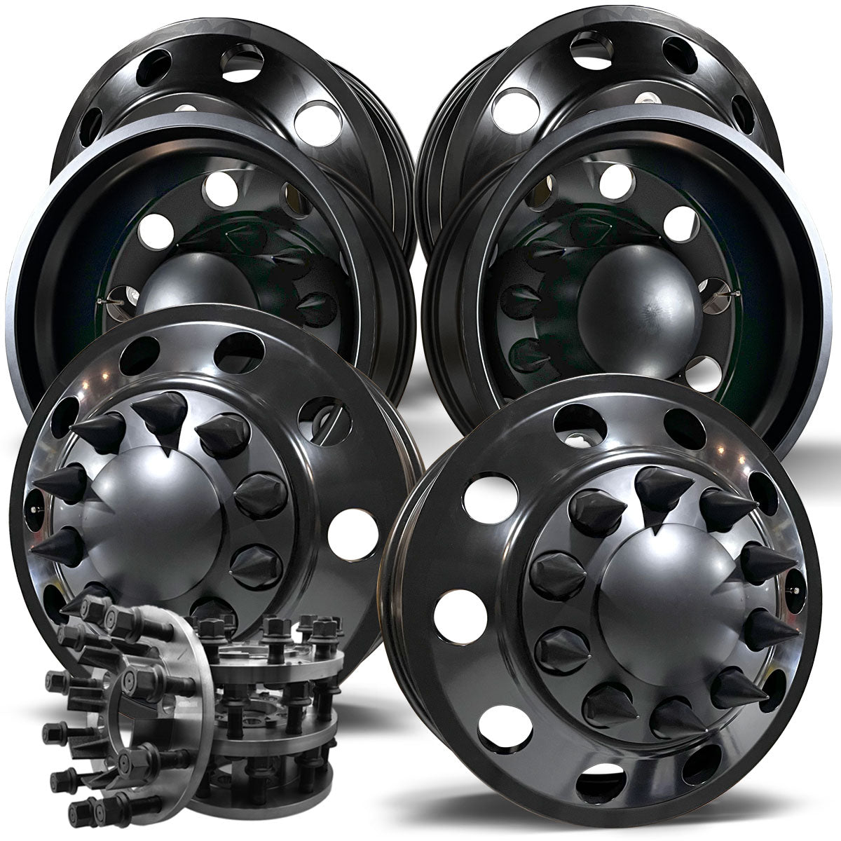 Upgrade your 2005-Present Ford F450 or F550 Dual Rear Wheel truck with this complete 22x8.25 Satin Black polished forged aluminum wheel kit, engineered specifically for heavy-duty 10-lug Ford applications.